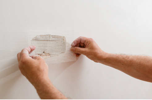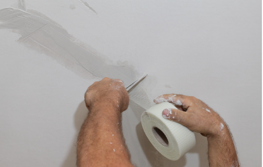 - Siūlių tvirtinimas: Uždėkite armavimo tinklelį arba popierinę juostą ant siūlių tarp lopo ir esamo gipskartonio.