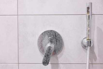 Kalkių nuosėdos dažniausiai pasireiškia kaip baltos, sunkiai nuplaunamos dėmės ant čiaupų, dušo galvučių, vonios ir plytelių, jų siūlių.